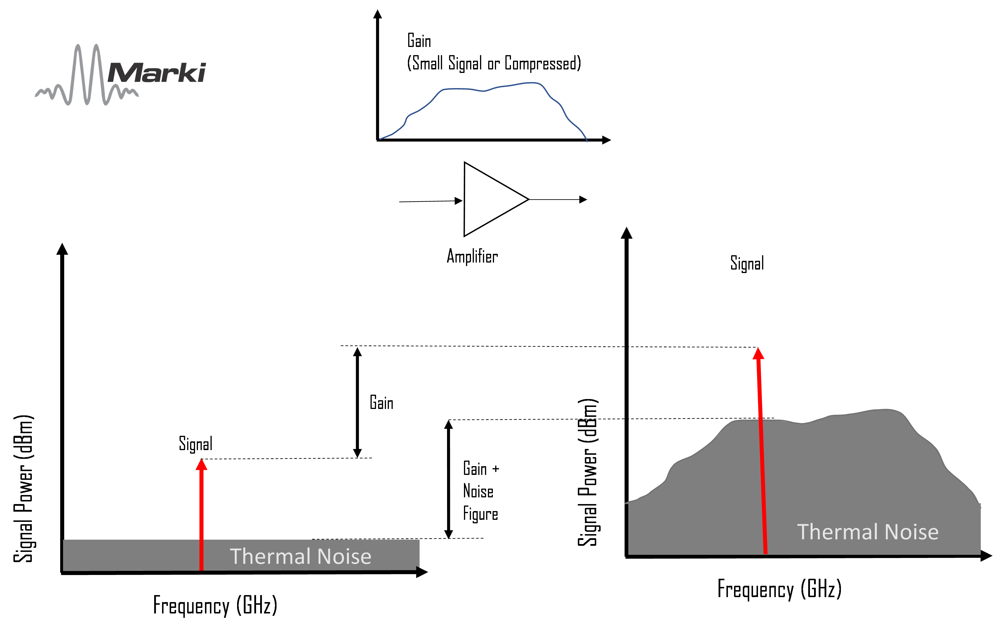When determining the noise contribution from our amplifiers, it is important to understand that the typical gain that’s reported for amplifiers will not necessarily be a constant value across band, but rather an average across the band of the amplifier. For this reason, gain vs frequency will result in noise power that varies with frequency (Watts/Hz) dependent on the amplifier that is used. This is particularly important for noise at fIF, which may be out of the operating band of the LO amplifier and at a frequency that is not well specified. The LO amplifier may supply significant attenuation, or it may supply gain.