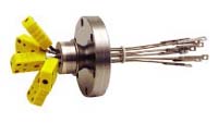 The single conductor thermocouple feedthroughs, which are offered as a loop type or spade type, are available in Chromel, Alumel, Iron, Constantan, Tungsten 5% Rhenium, or Tungsten 26% Rhenium. These single conductor thermocouple feedthroughs allow for an array of custom arrangements.