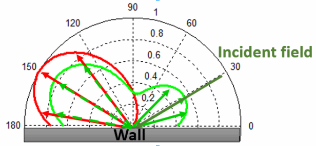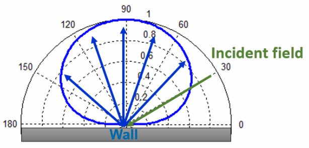 When the incident ray (green) reflects off the wall, the Lambertian model scatters the rays normal to the wall. The energy then drops off to the sides. The scattering coefficient input for this model determines the fraction of the field that scatters diffusely instead of reflecting.