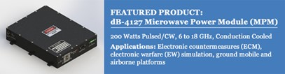 dB Control's microwave power modules (MPMs) cover the 2-40 GHz frequency range and are available with continuous wave or pulsed power. Each MPM is a complete microwave amplifier that utilizes both traveling wave tube and solid state technology.