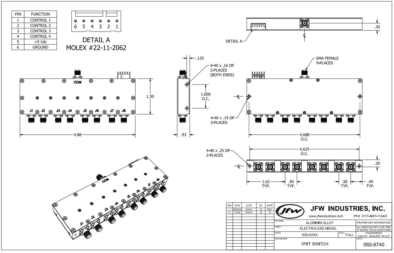 JFW has added a line of 50 Ohm solid-state RF switches that operate 20MHz to 8GHz. These commercially rated models are ideal for constructing low cost RF testbeds for automated testing. The switches are controlled with TTL control lines. The switches can hot switch up to +26dBm with typical isolation of 55dB at 8GHz. Download the available datasheet to learn more.