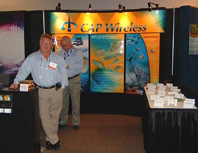 CAP Wireless had a range of products on display at its booth. Of note was a prototype 2-20 GHz, 10-Watt (max) solid-state ultrabroadband power amplifier (PA) that incorporates 16 individual MMICs. Mark Lampenfeld (above), executive VP, informed me CAP is already developing the next generation of the device (15-20 Watts). CAP also showed a series of PAs, including the CPM0220-2S, a 2-20 GHz, 21 dBm module for surface mount applications.