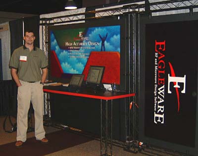 Eagleware, located only 20 miles from downtown Atlanta, rotated booth labor regularly over the course of the exhibition. When I stopped by the booth, it was R&D engineer Dan Savio's turn (see picture above). He informed me that the SPECTRASYS full spectral-domain system simulator was drawing the most attention during the show. CEO Todd Cutler also participated in RAWCON 2004, representing Eagleware in a panel discussion on CAD software for wireless technology Tuesday night.