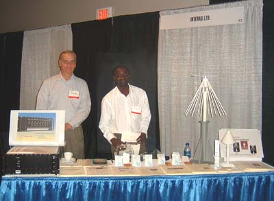 Sylvan Thompson, engineering supervisor for Interad, had a significantly longer drive to RAWCON (10 hours!). He showed me Interad's newest unit, the Model 3100 modular HF receiver system featuring phase coherence, no local oscillators, high dynamic range, and a Firewire output. In the picture above, Thompson (right) and John Visotsky of V-TEK Associates stand behind Interad's display of antennas and systems.