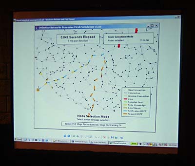 OrderOne Networks, a start-up founded by David Davies and Chris Davies, claims to have overcome a major limitation of current mesh networking techniques -- the ability to scale more than a few hundred to a thousand nodes. OrderOne's organizing principle, demonstrated publicly for the first time at RAWCON 2004 (see picture above), enables scaling to tens of thousands of nodes and beyond. The company hopes to license their patent-pending method to device manufacturers for both commercial and military applications.