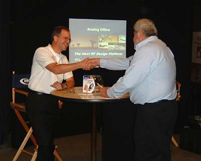 Applied Wave Research (AWR) provided demos of its entire suite of software products at the RAWCON exhibition. I spoke with Jerry Gebhard, director of sales - central and southeast region, who told me that AWR is preparing to ship 2004 product line (including Analog Office, Microwave Office, and Visual System Simulator) in the next few months. Above, Gebhard (left) enjoys a light moment with Bill Clausen of Technical Systems Integrators.