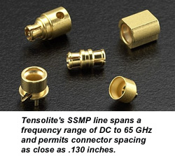 Tensolite brings its SMP and SSMP lines of blind-mate push-on connectors to the microminiature party. The SMP series touts a frequency range of DC to 40 GHz and permits connector spacing as close as .170 inches for an assortment of military, space, and telecommunications applications. The SSMP series ratchets it up a notch in frequency (to 65 GHz) and down a notch in size (spacing to .130 inches) for smaller, lighter systems. SSMPs are offered in popular interconnection versions for cable assemblies, surface launch, edge launch, hermetics, adapters, and loads. For more information, download Tensolite's RF/Microwave Products Catalog.