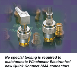 Winchester Electronics just released its QC-SMA series of SMA connectors, which cover the frequency range of DC to 6 GHz. These connectors incorporate a push/pull style of mating, which allows them to be connected and disconnected without the need for special tooling. (This is in direct contrast to standard SMAs, which must be torqued for proper installation.) Once QC-SMA connectors are mated, they can rotate 360 degrees without losing connection. In addition to test environments, these connectors can also be used in microwave subsystems, base stations, mobile radios, and other applications. For more information, download the QC-SMA datasheet.