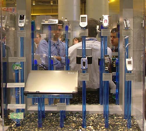 RF Micro Devices, on the other hand, went small. Its booth featured a tank filled with thousands of the company's chips, as well as some of the devices in which they are used.