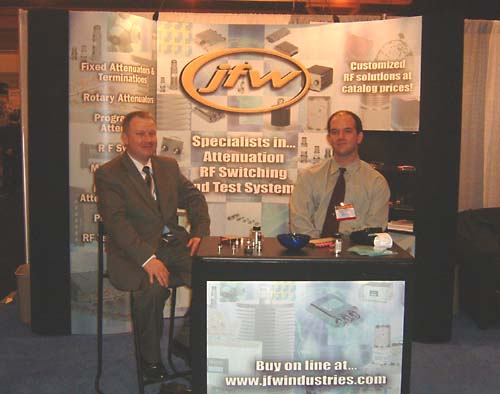 After spending all week on their feet, Eric Merkle of RF Globalnet and Bryan Walker of JFW Industries take a load off at JFW's booth.