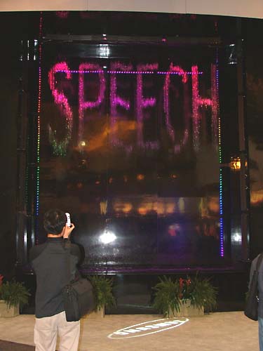 The competition for attendees' attention was fierce. One of the more successful displays was Samsung's 20-foot-high waterfall, which dropped precise streams of water to form patterns, images, and even words (as shown here) in the air.