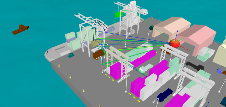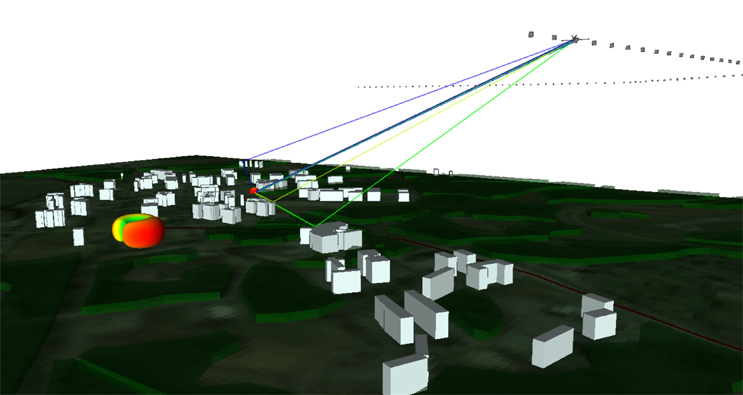 Visualize the multipath within views of the scenario, showing the dominant paths that signals follow through a scene and the structures they interact with. Show how blockage and interactions with terrain, foliage, buildings, or other structures affect signal propagation between a base station and a walking pedestrian, a moving truck, or a flying air or space vehicle as it moves through a digital twin of a dynamic scene.