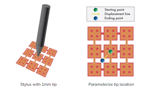 Similarly, a stylus can be analyzed. Using a parameter sweep in XF, the location of the tip can be moved along the displacement line without needing to recreate the stylus for each location.